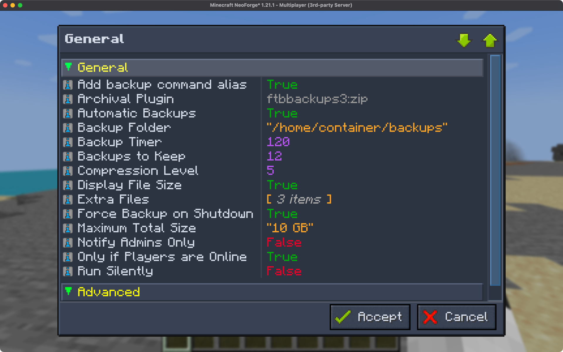 | Display file size display_file_size | Broadcasts to all online players a "(current size | total size)" message when backup is done. | true |